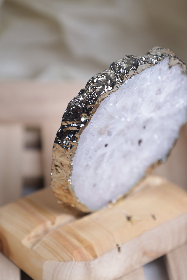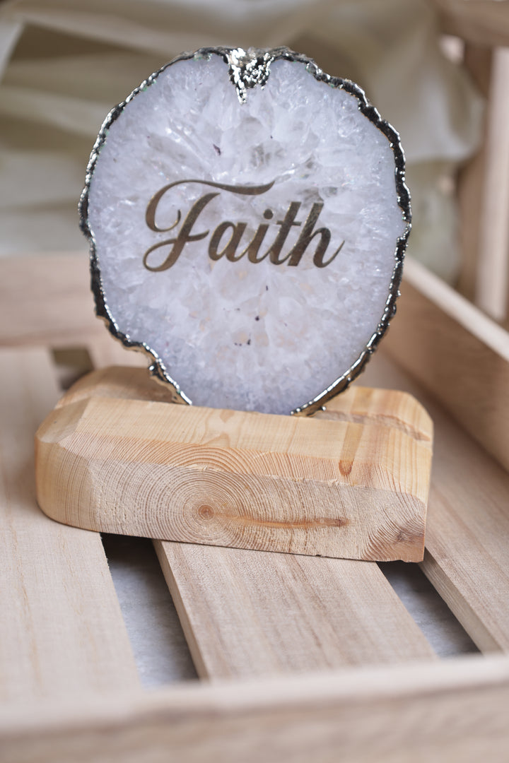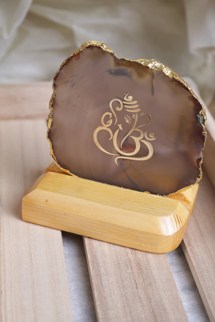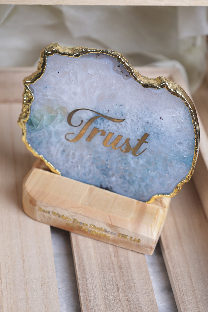A natural agate slice mounted on a wooden stand, carrying your customizable message. A unique keepsake that blends the beauty of gemstones with a personal touch — perfect for gifting, décor, or heartfelt moments.